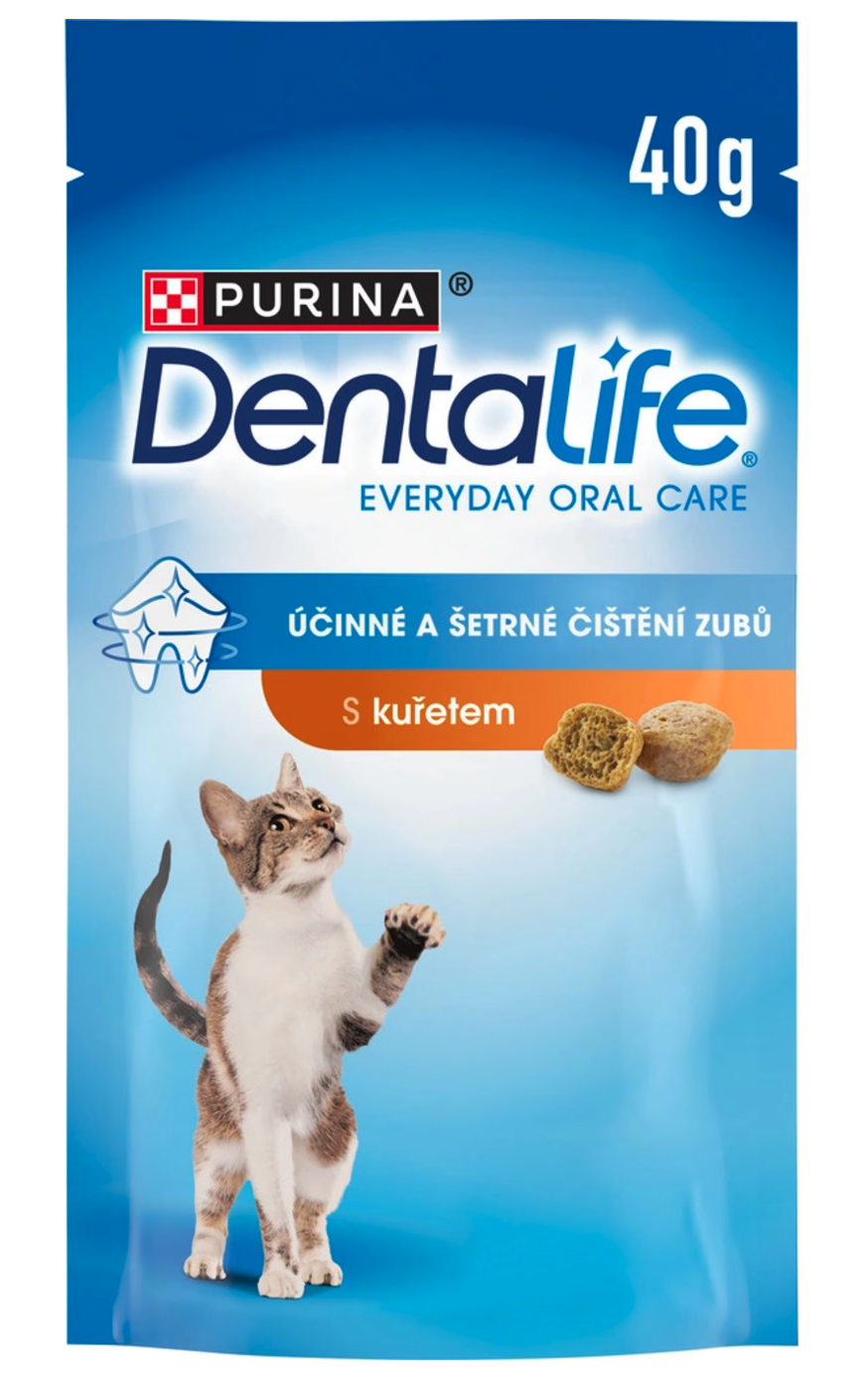 Purina DentaLife Cat Chicken je chutná dentální pochoutka, která pečuje o ústní zdraví koček každý den. Unikátní křupavá a porézní struktura čistí i hůře dostupné zuby, její tvar a složení pomáhají snižovat tvorbu zubního kamene. Vědecky ověřené složení přispívá k svěžímu dechu a zdravějším dásním. Každý kousek chutná po kuřecím mase, takže si kočka čištění zubů skutečně užije.