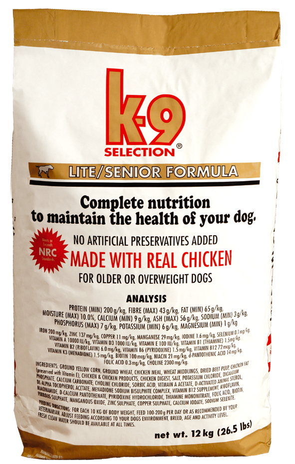 K-9 Lite je kompletní krmivo pro udržení a kontrolu hmotnosti u psů s nadváhou,u psů s nižší fyzickou aktivitou a u psů starších. Krmivo má sníženou energetickou hodnotu, má méně tuků aoptimální množství dietní vlákniny. K-9 Lite je kompletní krmení, žádné doplňky již nejsou potřeba. Toto krmivo poskytuje psovi pocit dobrého a chutného nasycení při konzumaci menšího množství kalorií.